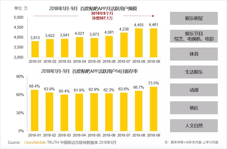 以百度贴吧为代表的社群媒体平台向泛娱乐垂直社群延展,今年以来月活跃用户规模持续增长,活跃用户14日留存率也在上升中。