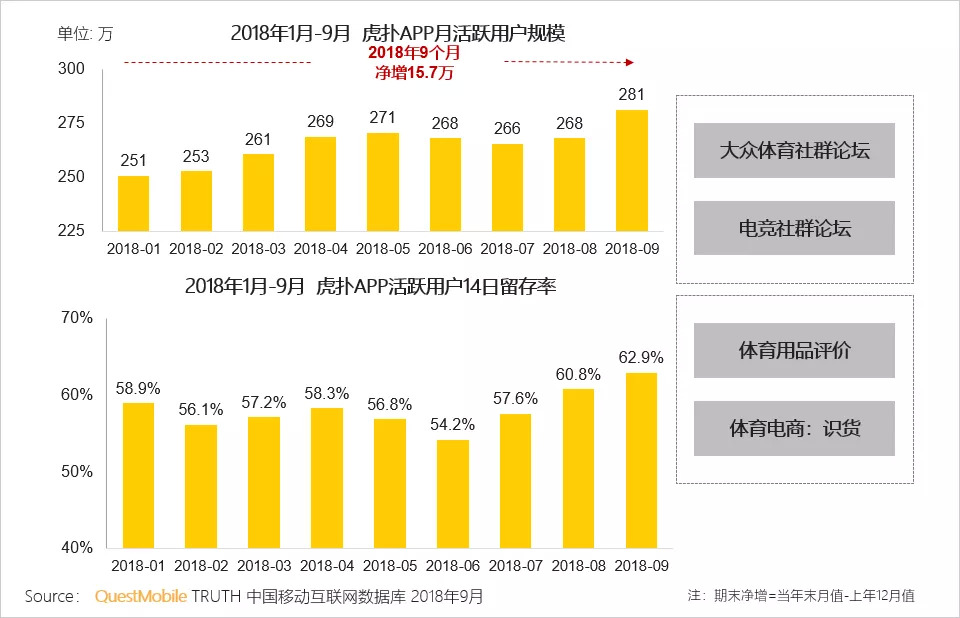 以虎扑为代表的圈层媒介,向体育社群和体育电商的业务延展,今年以来月活跃用户规模持续增长,活跃用户14日留存也在上升中。