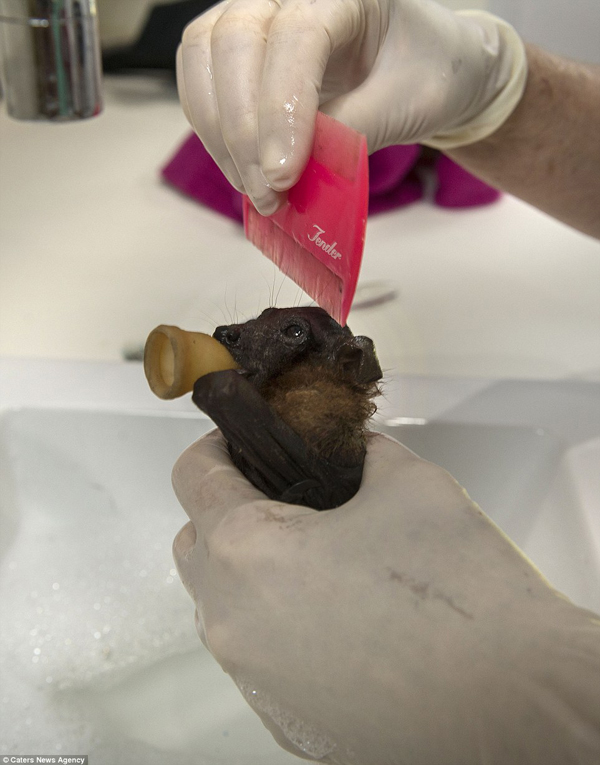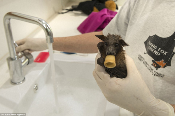 蝙蝠医院的工作人员和志愿者会温柔地给它们洗澡,把它们放在篮子里喂奶。