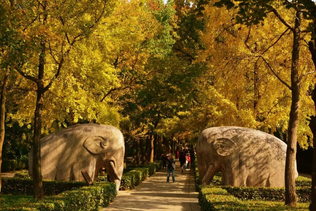 明孝陵的石象路,被南京人称为“秋色最美的600米”。到了秋天,整条路都被金黄色的银杏叶给覆盖。在明孝陵的方门和红门之间,有十余株银杏树,金黄的树叶,朱红的围墙,皇家气派真的挡也挡不住。