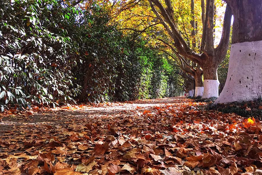 南京城最密集的梧桐树在中山东路,最有名的是美龄宫的环陵路,但是最美的梧桐大道还是灵谷寺路。每到秋季,道路两旁地上落满了金色的树叶,由于路过的车比较少,踩在落叶上的“沙沙”声清晰可闻。