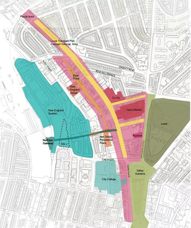 对于布莱顿来说也是如此。在改造开始之前,城市中心区域的 London Road 是一条主要街道,沿街布满零售商铺,街道周围皆是城市服务设施,如居民楼、社区大学、集市等。布莱顿的改造项目是以 London Road 为中心,或者说,为主体的。与国王十字的亟待整顿不同,London Road 区域的问题相比之下并不算严重,主要面临的是形象老化问题以及 London Road 主干道车辆众多导致的空气污染。
