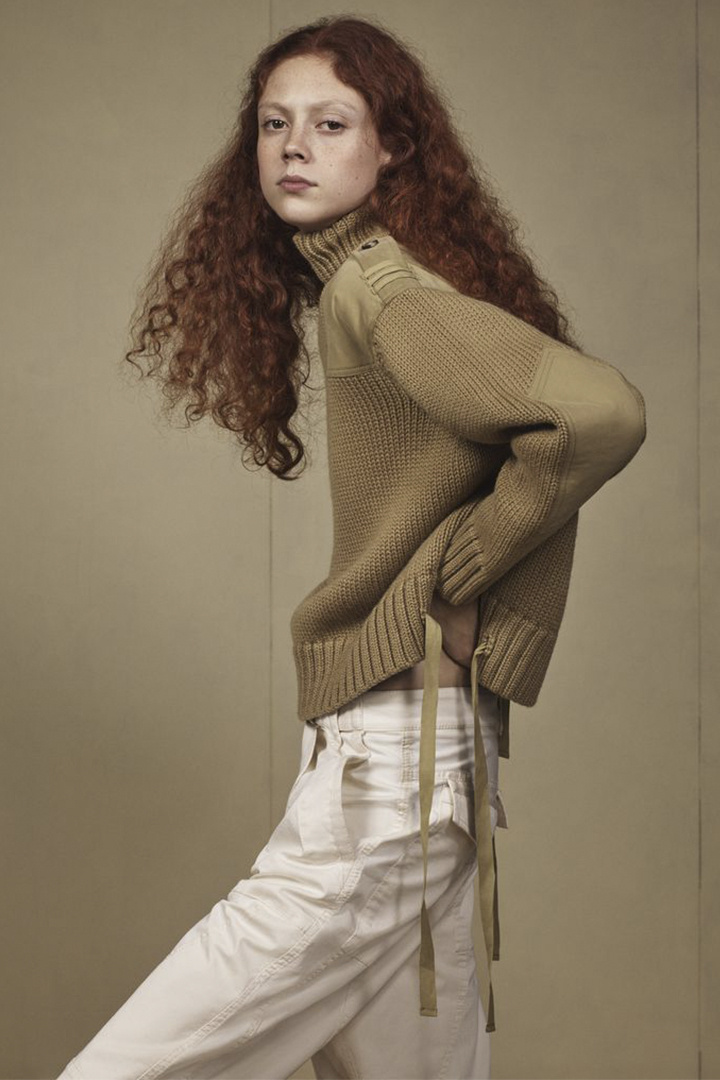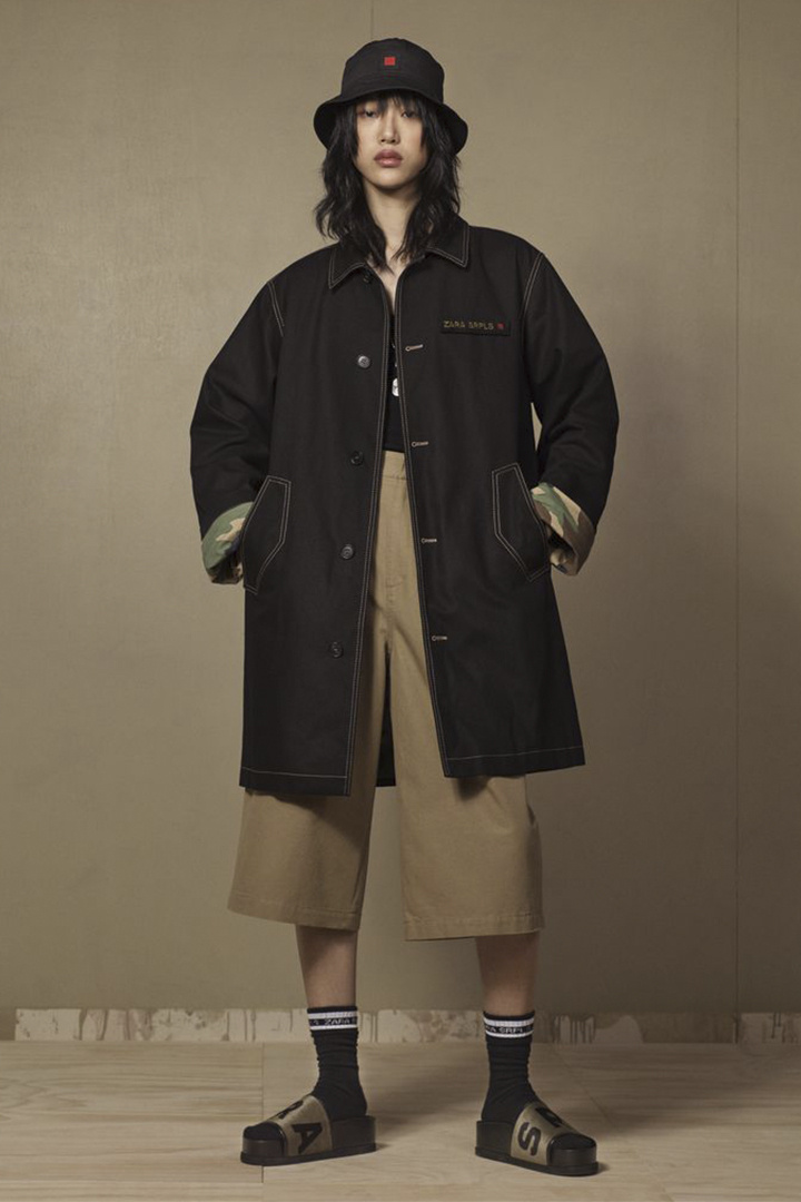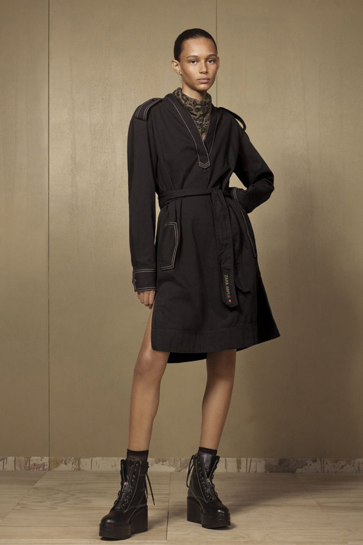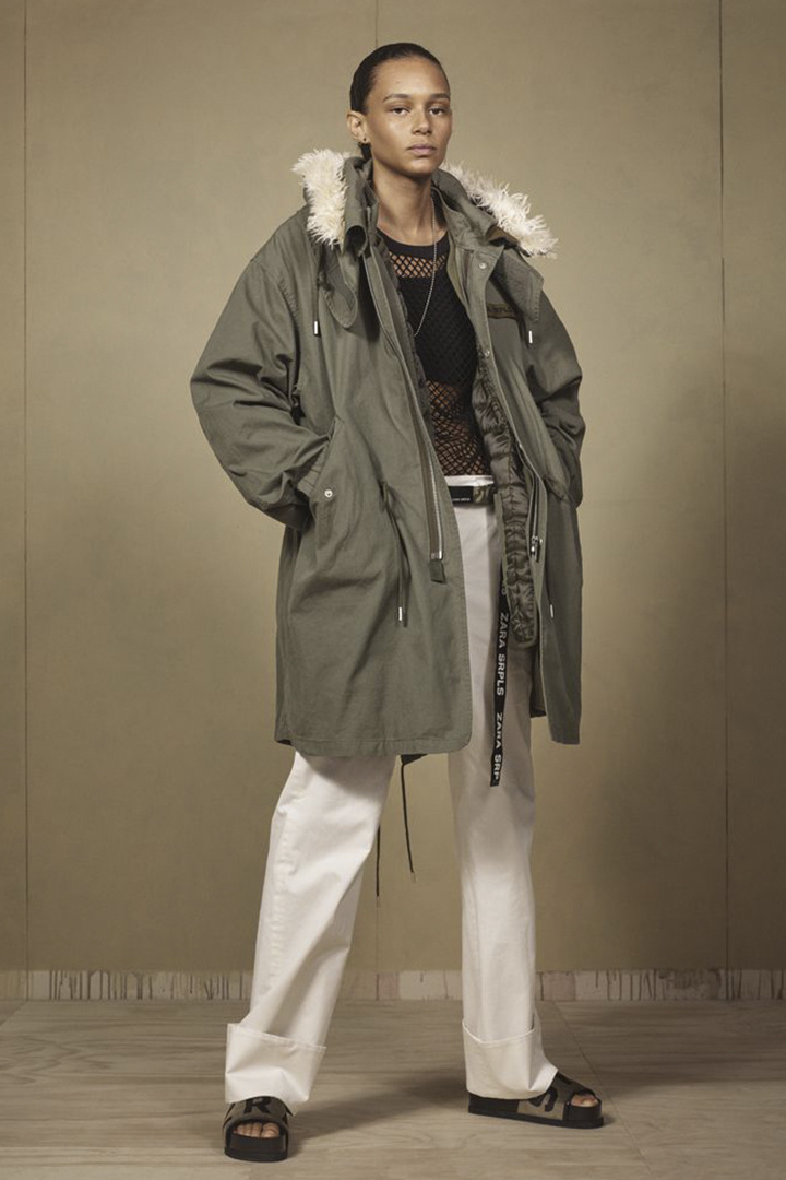 Zara Srpls以中性军装风格为主打,裁剪利落的黑色大衣、丹宁材质夹克以及绑带马丁鞋让整个系列呈现出十分硬朗的气息。虽然以卡其色、黑色与军绿色作为主调,但棉绒针织卫衣、网状恤衫以及丝质配饰的搭配则给这个系列带来了温柔的气息。