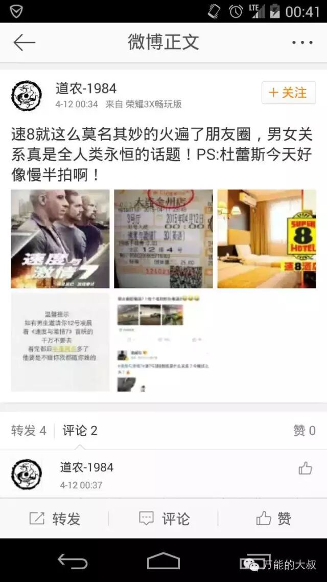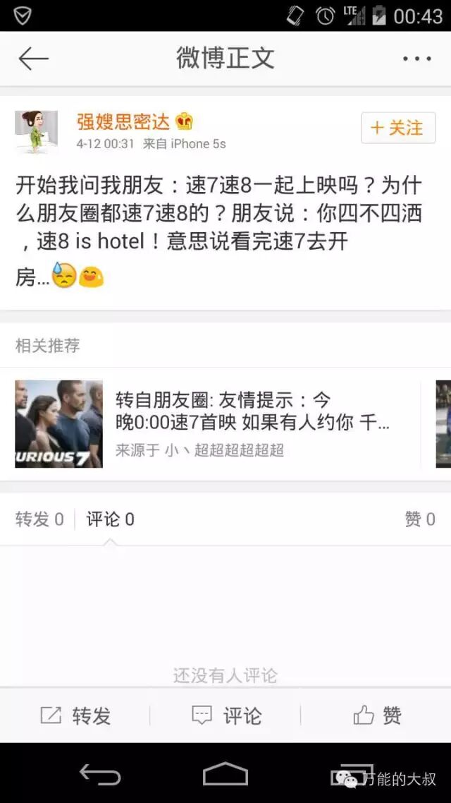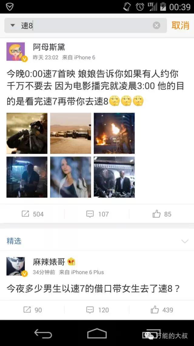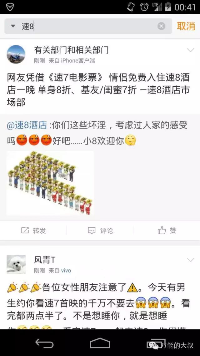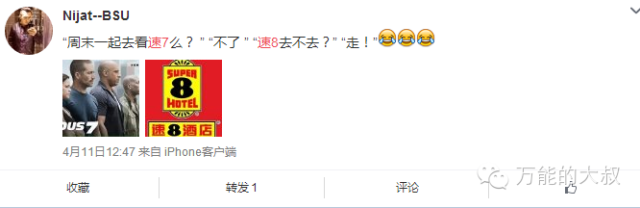 就在大家晒着电影票和电影海报“装逼”的时候,一个段子出现了,时间大概是晚上10点左右,大叔的一个微信群里出现本文第二段的那个段子。大叔当下就觉得很有趣,虽然其实我不太关注速7这部电影,还是立刻分享到了其他几个群。然后一刷朋友圈,已经有朋友在分享这个段子。瞬间,“速8”这个关键词开始与“速7”形成强绑定关系,无论在微博还是微信平台,这个段子一下子开始疯传。