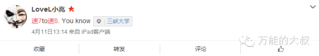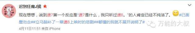 经过搜索,大叔发现,最早的一条相关微博段子出现在4月11日11点51分,之后,“速7和速8”相关话题经过不少用户的智慧改编之后,最终形成那个广为流传的。