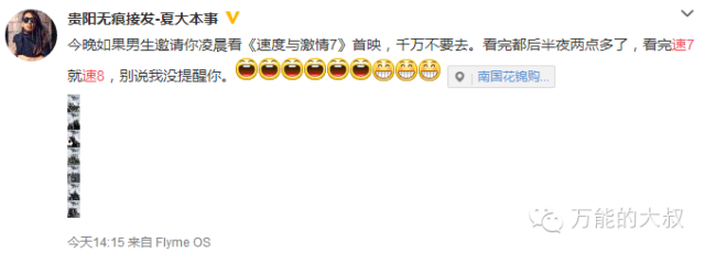 “今晚如果男生邀请你凌晨看《速度与激情7》首映,千万不要去。看完都后半夜两点多了,看完速7就速8,别说我没提醒你。”