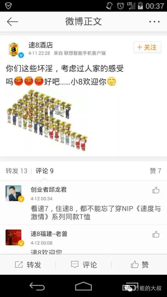 2、如果真是速8的炒作,品牌方就不应该简单发一条微博,而是在后期准备了大量的应对这个段子火爆的措施,比如像有网友建议“拿速7电影票根打折住速8”,或者其他更高明的方式,把自己的品牌调性借机展示。