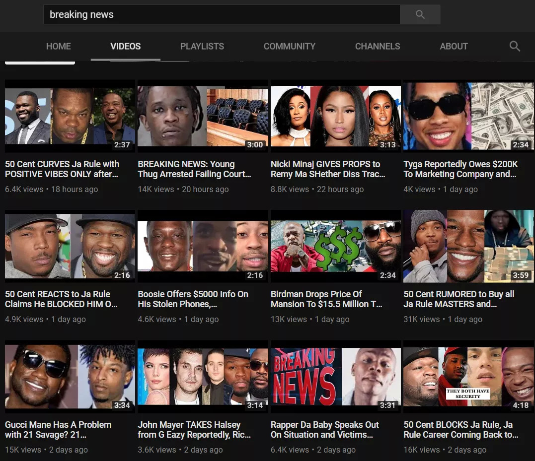 在YouTube上,世界各国的上传者为了争取(骗取)点击和贴片广告费,会在一些突发新闻出来的时候,抢着发一些“混淆视听”的视频内容。最开始,网上可能只有图文消息出来,暂时还缺乏电视台或广播电台的真人播报录像,或者这些录像会因为版权问题被清理掉。那么,这一段时间之内如果有人去YouTube试图寻找新闻报道,就会遇到一个“空窗期”。