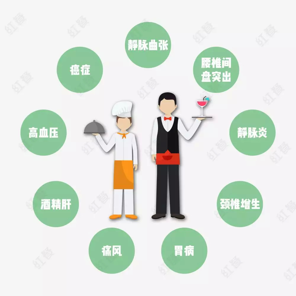 调查显示,除静脉曲张外,腰椎间盘突出、静脉炎、颈椎增生、胃病、中风甚至癌症都是餐饮人常见的职业病。