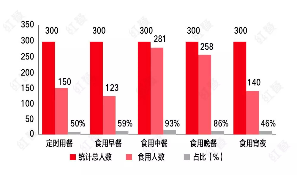50%以上的受访者没有定时用餐,超过 40% 的受访者不食用早餐,有将近 7% 的受访者不吃中饭,14% 的受访者不吃晚饭,超过 53% 的受访者有吃宵夜的习惯。