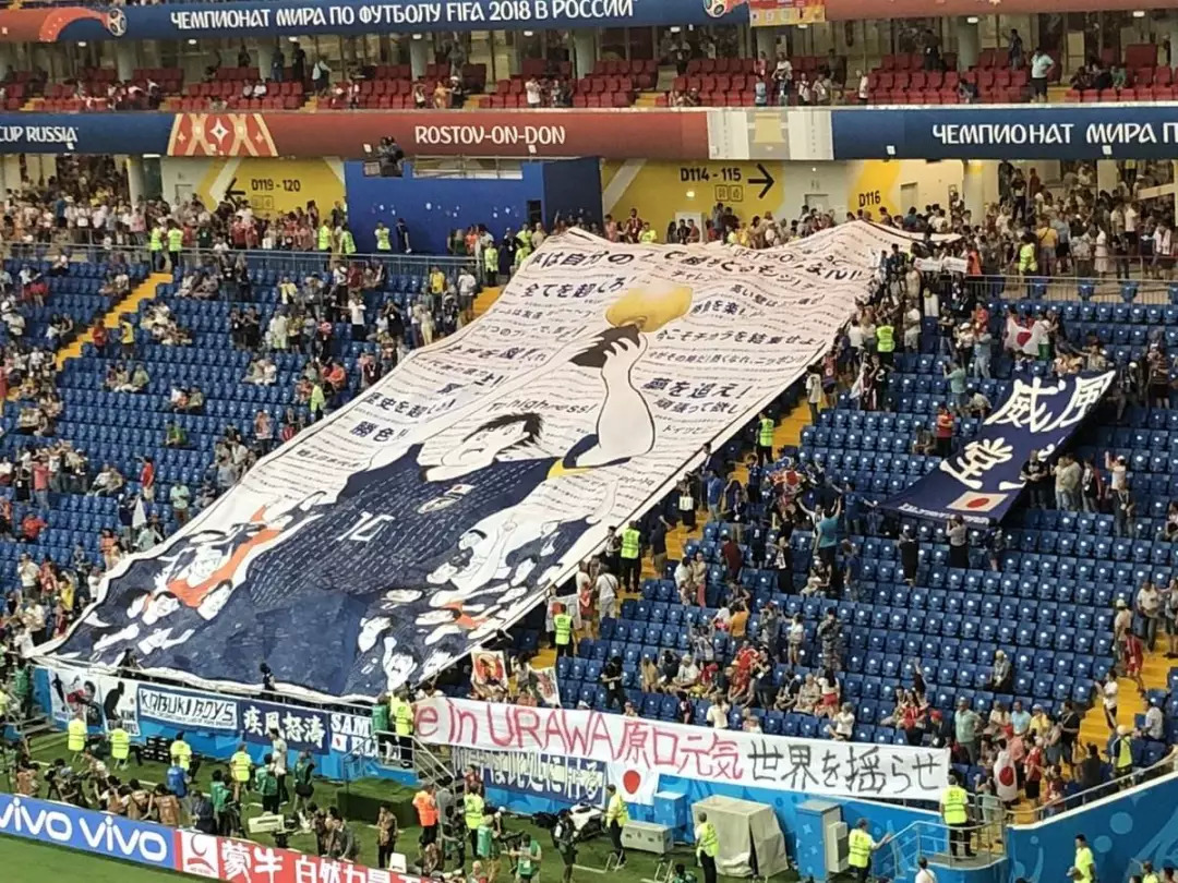 2018年世界杯八分之一决赛中,日本球迷在看台上挂起了大空翼的巨幅海报……
