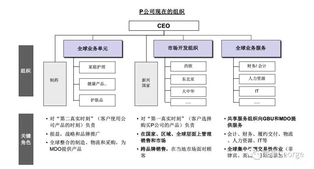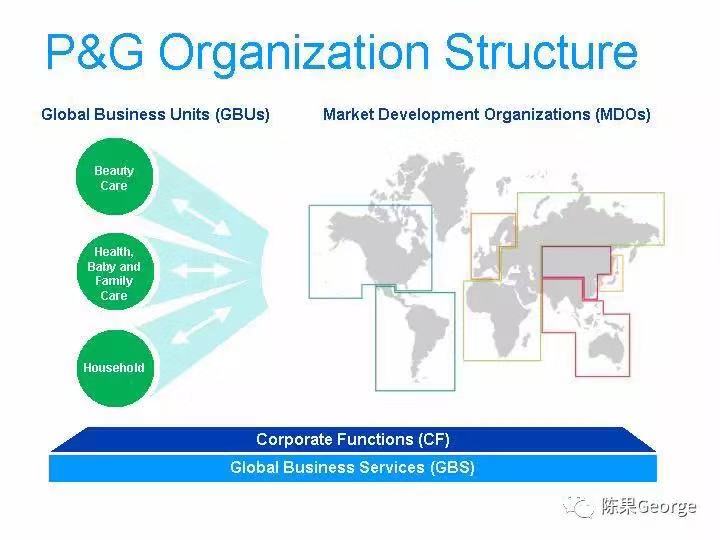 雷富礼继承了Durk对产品事业部(GBU)的规划,但是保留了区域营销组织,将其称为“市场开发组织”(MDO),与GBU形成矩阵关系。同时,将后台职能体系分为两部分:对于财务、人力资源、采购等具备共性、流程标准化的事务性职能,形成共享服务体系,称为“全球商业服务”(GBS),对GBS的操作上,进行全球化的内包,部分功能甚至外包给业务流程外包服务公司;另一部分总部职能,例如公关、法务、资本运作等,作为“总部职能”(CF)。