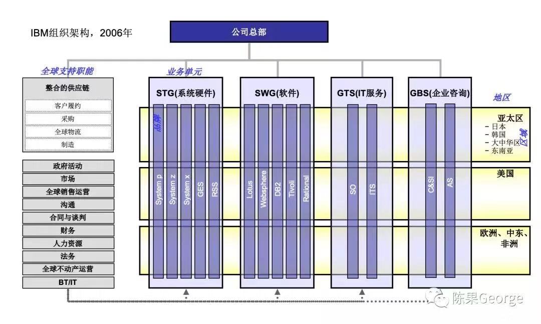 2006年时,IBM的四大业务单元(硬件、软件、技术服务、业务咨询)作为管理第一顺序级的、全球整合的损益单元,每个业务单元之下有各个“品牌”的二级损益单元,而区域(大区分为两个,即美欧日成熟市场地区,和发展中市场地区-称为GMU,每个大区之下再分为若干个小运作区域)作为跨品牌销售的销售组织,以及管理第二顺序级的损益单元;产品和区域形成矩阵式组织。各个支持职能逐步推行全球整合、流程标准化及向共享服务转型。