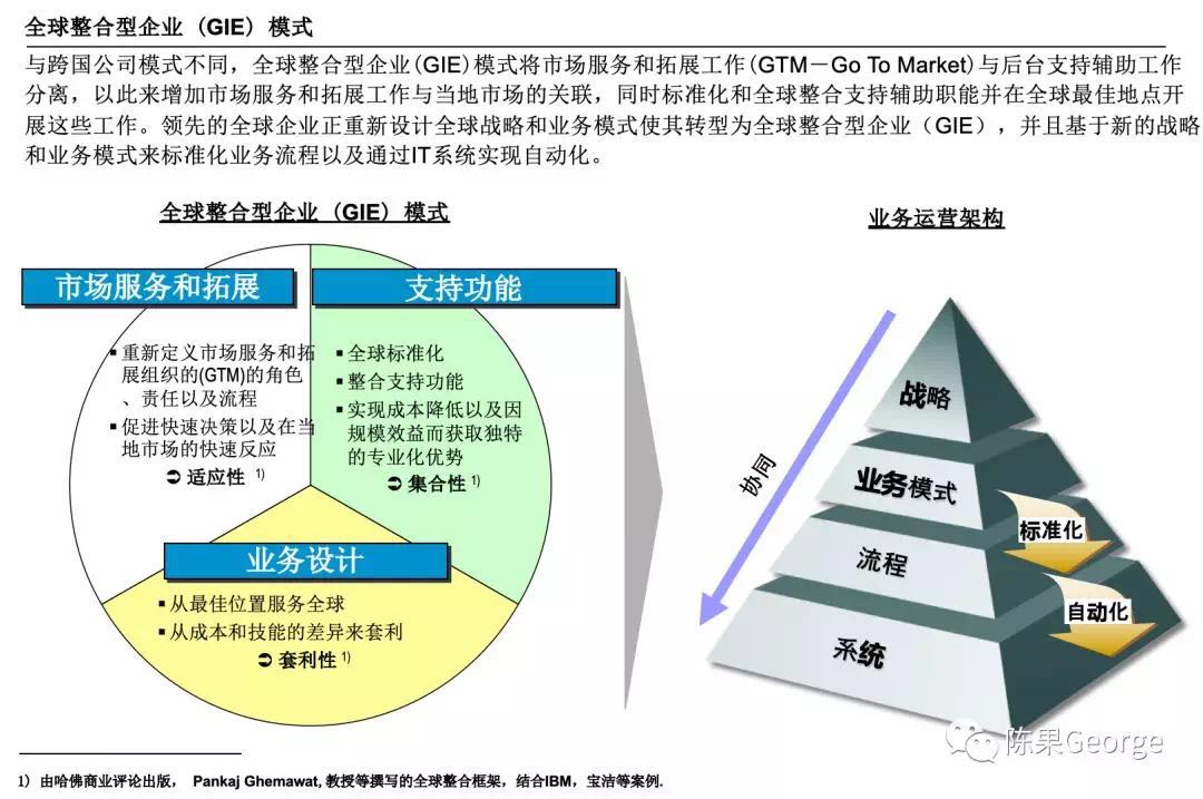 2006年5月,郭士纳和哈佛大学教授Pankaj在美国《外交事务》杂志上合作撰文,将IBM、宝洁等全球性公司的这种管理模式称为全球集成企业(Globally Integrated Enterprise,简称GIE),从理论高度上进行了提炼。