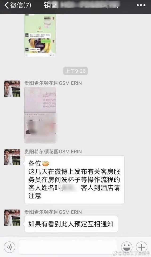 11月16日上午,@金箍棒花总在微博发布微信截图,疑似贵阳希尔顿花园酒店销售部微信群中公开了他的个人信息,图片中显示,“如果有看到此人预定相互通知”、“客人到酒店请注意”等信息。