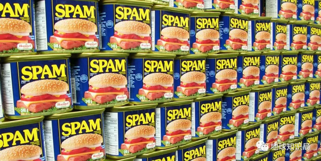 大萧条时期,美国肉制品巨头荷美尔(Hormel)公司把美国人吃不了的多骨的猪肩肉剁碎,加入盐、水、淀粉成型,再塞进方方正正的罐头里,就有了最初的午餐肉。荷美尔公司将午餐肉起名为“Spam”,说是“Spiced Ham”(香料火腿)的缩写,但是里面并没有火腿。为了防止人们说它欺骗消费者,Hormel往里加了不到10%的猪腿肉。