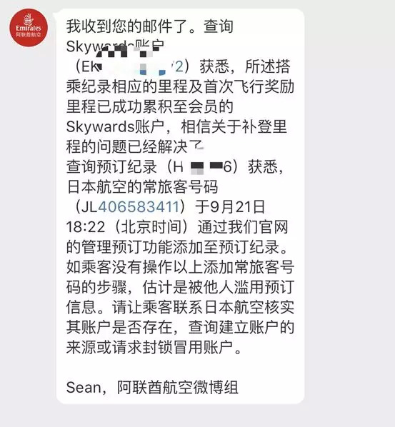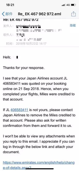 阿联酋航空:我们查到了您的里程被日本航空一个 JL406583411 的号码领走了,请联系日本航空,追回您的里程,到时候有进展了别忘了回复我们哦。
