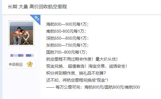 繁琐的审核过程阻挡不了“积分贩子”的热情,收购航空里程的消息从贴吧到 58,从微信到淘宝,层出不穷。收购价一般 500~900 每万公里不等,即使积分贩子从中赚取了差价,和一些航程的官方票价相比,买这种 “ 免费票 ” 依然要便宜不少。