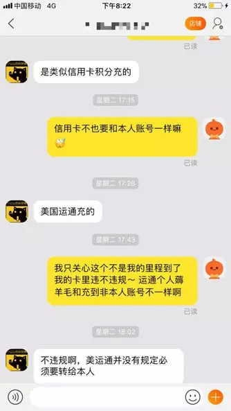 在一家淘宝店里,客服表示这种方式基本上是通过美国运通信用卡积分充值,因为美国运通没有规定积分必须转给本人,所以并不违规。