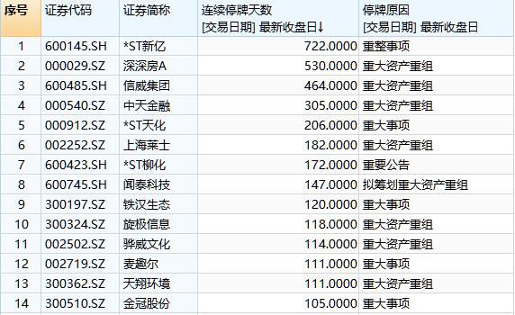 随着不少长期停牌企业的匆忙复牌,A股市场连续停牌超过100个交易日的上市公司已减至14家,其中,*ST新亿(600145.SH)、深深房A(000029.SZ)、信威集团(600485.SH)目前停牌时间高居前三,连续停牌交易日分别达722天、530天和464天。