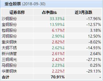 数据显示,2016年第三季度末,沙钢股份在中融国证钢铁中的持仓比例仅为5.21%,价值1.06亿元。而到今年第三季度时,中融国证钢铁对沙钢股份的持股数量未变,但仓位已升至33.33%,价值1.3亿元。