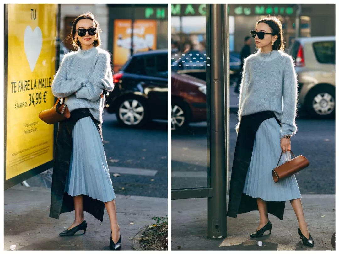 毛衣和半裙同色,高级look