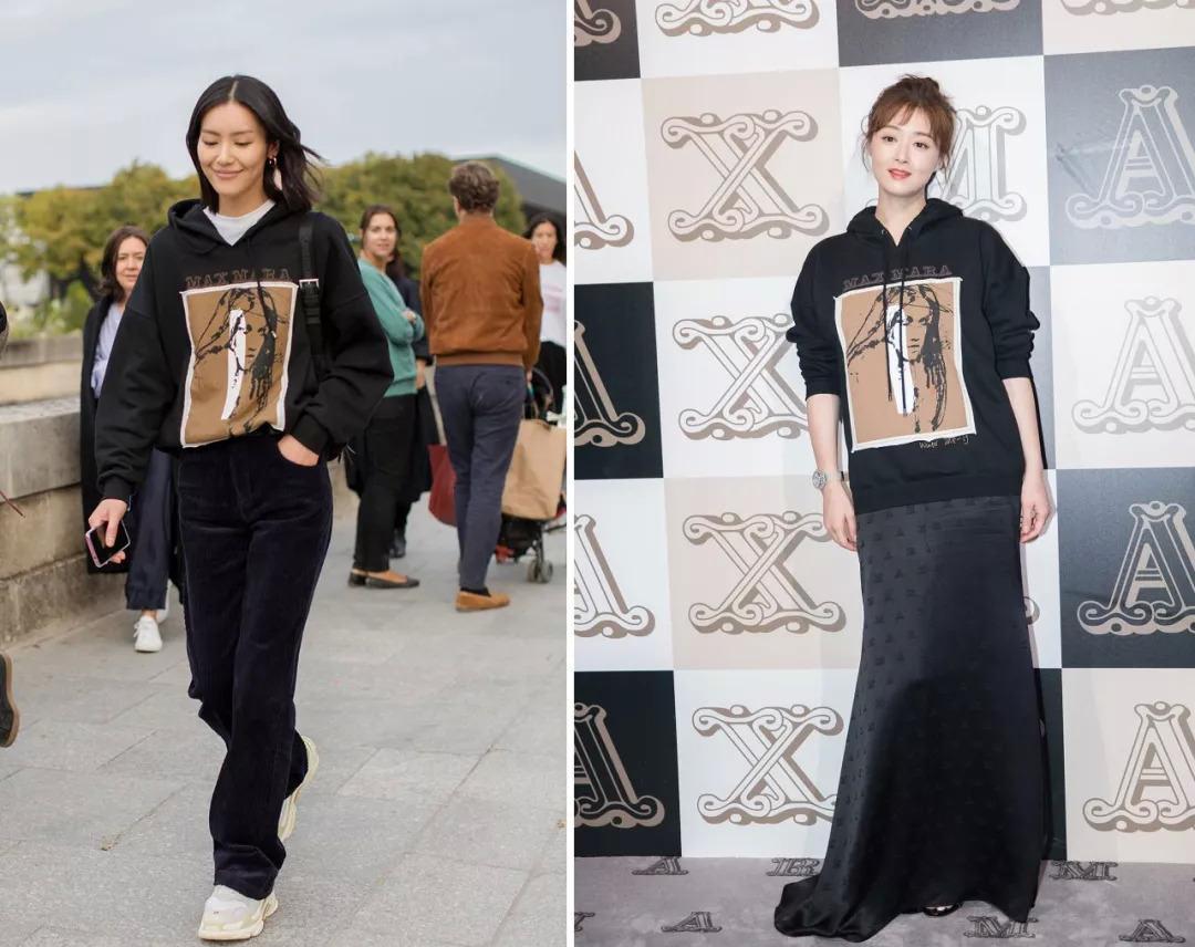 还有同一件oversized卫衣,即使都选择all black,蒋欣的造型质感就是不及表姐。这和穿衣细节的不同处理有关。