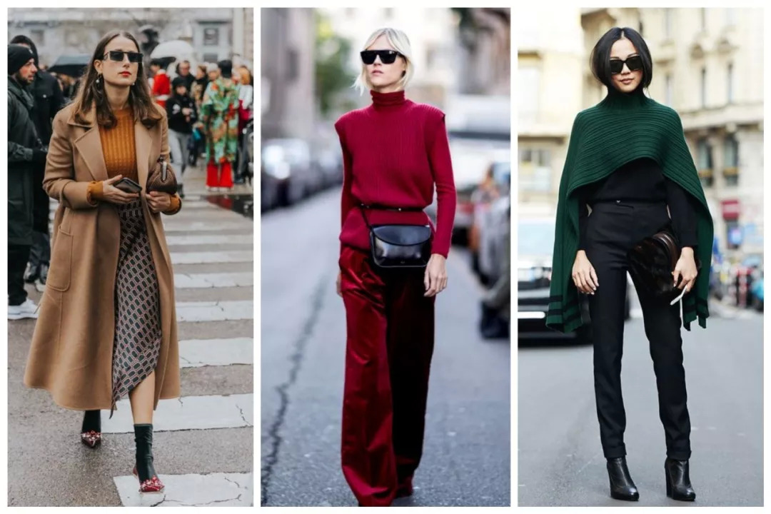 类似的,酒红、墨绿、橘色...都能用白色单品过渡,甚至只是小面积的叠搭高领/白T,都非常有效,还增加层次感。