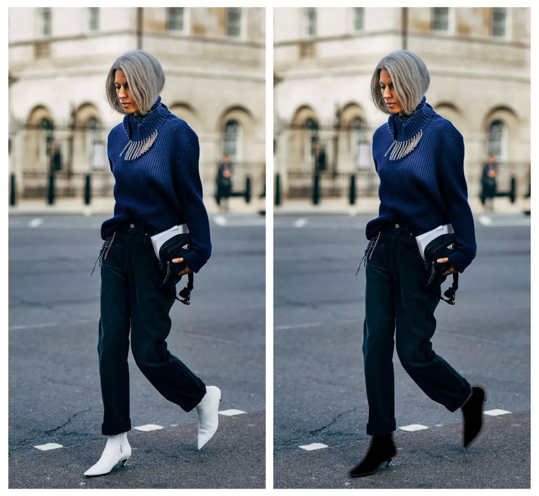 英版《VOGUE》责编Sarah Harris这一身,原本搭的小白靴,但灵魂P图手Miss 烧饼把鞋P成黑色之后,是不是立马没那么亮眼、特别了?
