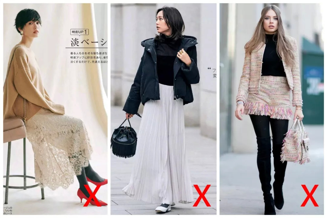 一般不建议穿材质太轻薄、颜色又浅的裙子。透出内搭,显得裙子质感巨low。加上季节感相差太大,导致整身不协调。