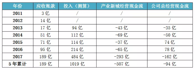 据公开数据整理的图表所示,最近5年,华夏幸福产业新城的投入累计达到1000亿左右,而结算仅不到亿元,其中还有接近200亿是没收到钱的应收款。也就是说,产业新城目前累计-500亿的现金流(还不算管理费的分摊),完全处于加速投入期。投资周期十分漫长。