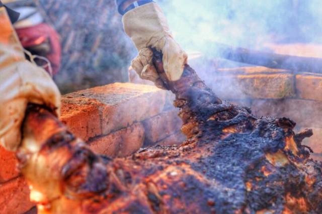 卵石内部炙烤,奶桶密封增压,带皮焖烤的羊肉汁水丰盈,最美味的是羊胸口部分。弹力、张力十足的厚肉,丰润油脂随着刀锋过处绽开,入口绵密浓烈,余香持久。