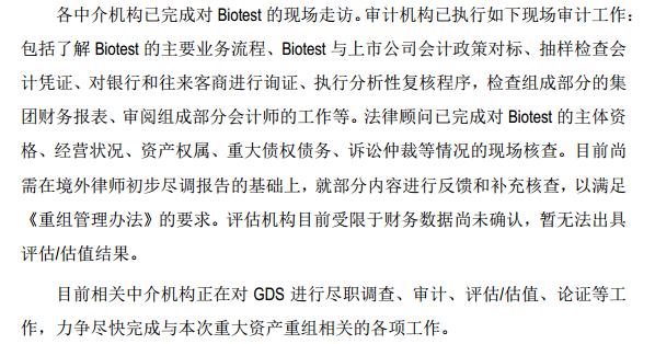 目前,此次资产重组正处于尽职调查及交易方案的沟通磋商阶段,Biotest的有关工作进展较快,而对于GDS的尽职调查、审计、评估等工作还在进行中,进度相对较慢。同时,此次交易尚需公司董事会和股东大会,交易对方和标的公司内部决策,交易双方有关机构备案审查,以及证监会审核等。
