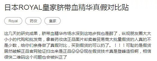 不过,目前Royal脐带血精华在中国存在假货泛滥的现象,小红书上有许多“辨真假”和吐槽假货的相关笔记,天猫上也有许多消费者质疑产品真假的声音。