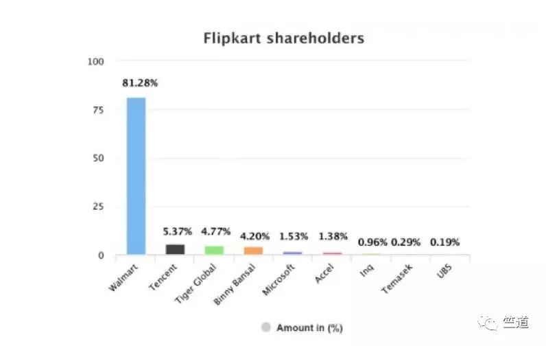 与此同时,沃尔玛还试图联手谷歌、微软和英特尔等新晋投资方来收购Flipkart公司的小部分股权,但最终此举并没有如愿完成。如下图所示,除了沃尔玛之外,目前Flipkart公司的股权最新比例为:腾讯5.37%,老虎全球管理基金4.77%、该公司创始人Binny Bansal 4.2%,微软1.53%,Accel Partners 1.38%,Iconiq Capital 0.98%,淡马锡 0.29%以及UBS 0.19%。