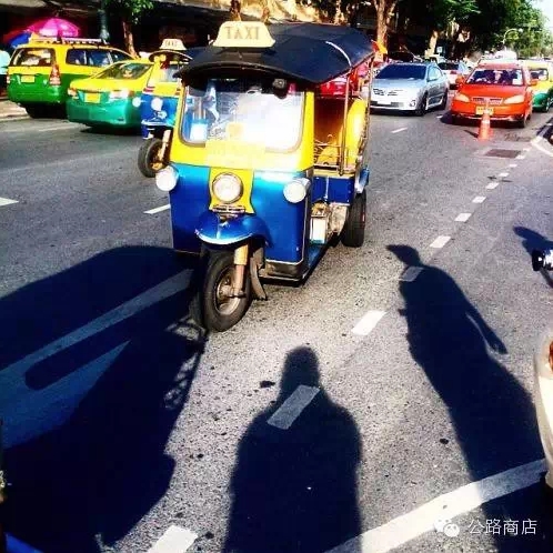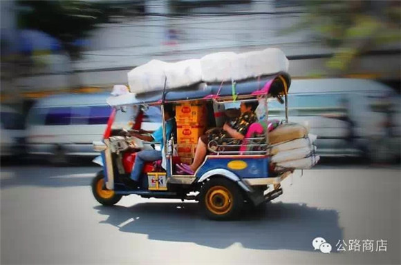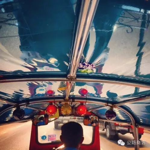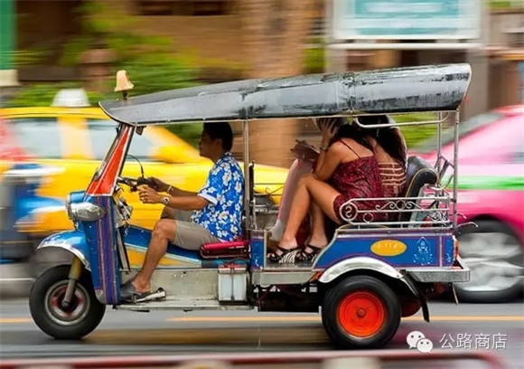 在泰国,TukTuk是最常见也是最方便的交通工具。它有些类似国内载客的三轮或四轮的内燃机车,全车四面透风,仅用几根钢筋搭起一个顶棚以遮挡日晒。因为行驶时发出巨大的“突突”声,所以得到了TUKTUK这个十分形象的别名。在中国我们把它叫作三蹦子,也是因为发出蹦蹦蹦蹦的怪声。