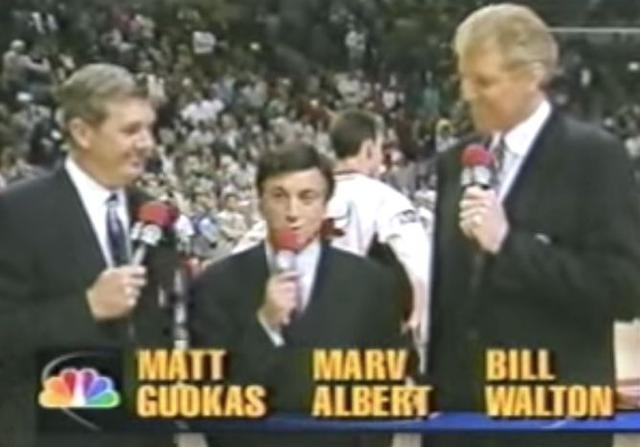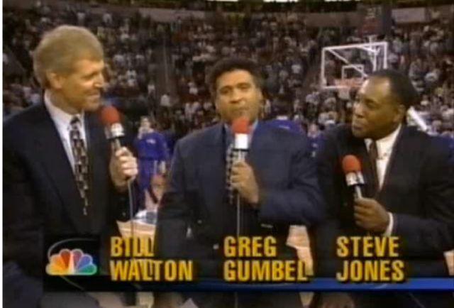 Greg Gumbel目前在CBS,疯狂三月NCAA转播时就能见到他的身影,其余两位都是前NBA球星,Bill Walton在总决赛时会加入Marv Albert和Matt Gudkas的阵容,主要讲解西部球队的战术,顺便提升下当时西部球队相对于东部球队(其实就是公牛)惨淡的人气。