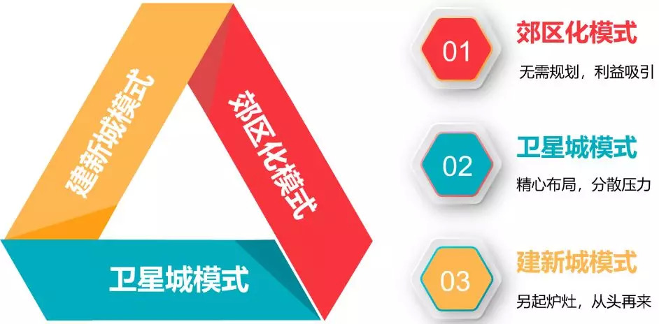 卫星城模式:是最为常用的一种模式。政府为缓解中心城区人口压力,通过行政手段在城市周边建几个新城,接纳中心城区转移出的人口,承接中心城区部分非重要功能。以伦敦、东京、巴黎为代表。
