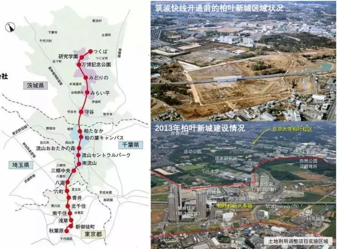 柏叶新城也是一个典型的TOD(以公共交通为导向的开发模式)项目案例,通过筑波快线上的“柏叶学园站”与其他地区相连。通过筑波快线与沿线便有多个新城开发项目相连,如终点站筑波、研究学园、万博纪念学园、守谷等。筑波快线(TsukubaExpress)的修建便捷地联络了东京都都心地区与东北部各个新城。