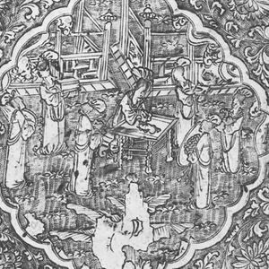 根据这一历史文献所记述的内容,反观大英博物馆藏银镜奁盖上的这幅图像。仕女作自画像,前后左右共计有六位侍女。与其自身绘画创作活动关系最为密切的三位侍女,距仕女最近,即左前方捧砚台者、正前方持镜者及女主人右侧拿唾盂者,呈半圆形环绕状。与仕女空间距离较远的其他三位侍女,分别持以口部捆扎结实的椭圆形袋子、上小下大的袋子、长方匣。为什么在女主人临镜写真之时,三位侍女携带这三件看来与绘画没有直接关联的物件呢?