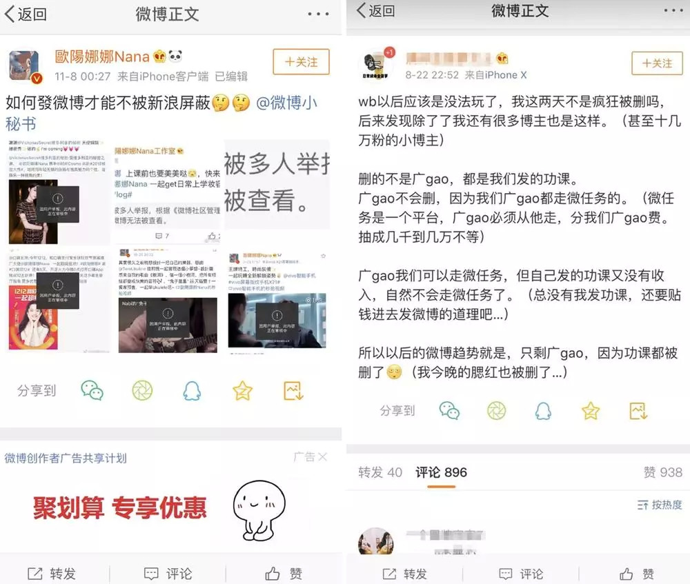 曾有网红吐槽,自己通过微博的广告平台“微任务”发布广告,被抽成几千元至几万元不等,但自己发布美妆功课时,却被强制删博,被判定为广告。欧阳娜娜在发布与品牌商的合作微博时,也有此困扰。有广告行业的网友解释称,KOL发广告帖子走微任务渠道,明星则需要通过新浪购买粉丝头条,否则发布与品牌主相关的微博,都会被屏蔽。