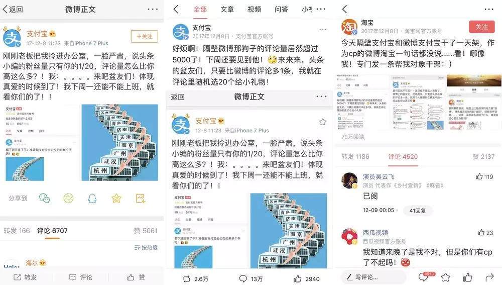2017年12月8日,以支付宝为导火索的微博与微头条大战事件,彻底引爆了两者间的流量较量。支付宝先在微头条发布了日常动态,随后在微博以“头条小编的粉丝量只有你的1/20,评论量怎么比你高那么多”引战,接着再精分回到头条,以“只要比微博的评论多1条,就在评论里随机选20个给小礼物”刺激用户评论,兄弟帐号淘宝也“火上浇油”的过来参一脚。最终,微头条以13万的评论力压微博的6700条,在此次交战中获胜。