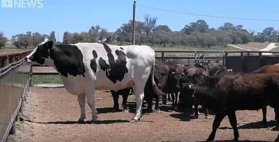 据卫报报道,西澳大利亚最近出现了一头巨大的公奶牛,体重超过一辆小汽车,登上了各大媒体的头条新闻。据报道,杰夫·皮尔森是普雷斯顿湖的主人,他在自己的庄园里养了一头重达1400公斤、高1.94米的公奶牛,名叫“灯笼裤”(Knickers)。据悉它只比创世界纪录的意大利奶牛Bellino矮8厘米。