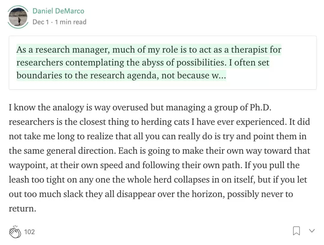 我知道这个类比已经被滥用了,但管理一群博士研究人员是我所经历过的最接近于养猫的事情。
