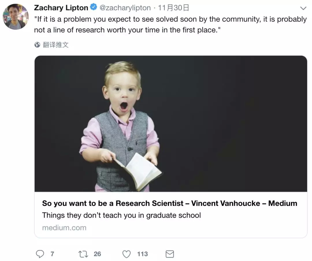 Zachary Lipton也转发了此文,评论道:“如果这是一个你希望社区很快解决的问题,那么它可能根本就不值得你花时间去研究。”
