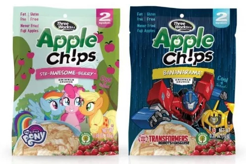 美国Hasbro公司与拥有变形金刚、香蕉女郎和彩虹小马等动画卡通形象的公司合作,推出了Three Works苹果片,这是一款非转基因零食,并且获得了犹太结食认证。这款苹果片中使用的原料很少,非油炸,富含纤维,不添加糖、人工色素、香精、脂肪、麸质、坚果和花生,口感和薯片类似。