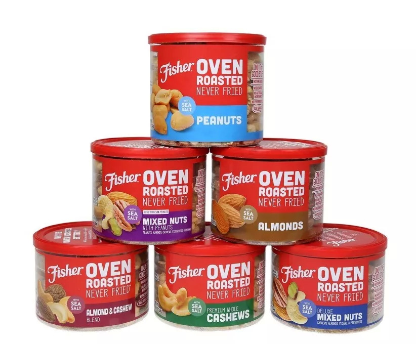 坚果制造品牌Fisher推出了其最新零食 —— “只烤不炸”坚果,其包括六种不同类型:奢华混合坚果、花生混合坚果、花生、混合杏仁腰果,杏仁、腰果。