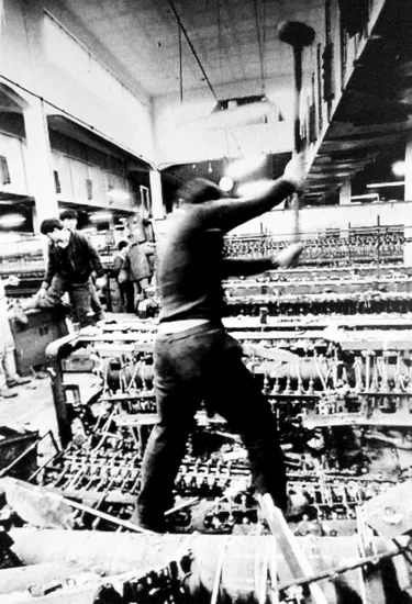 申新九厂工人举锤砸向纺织机