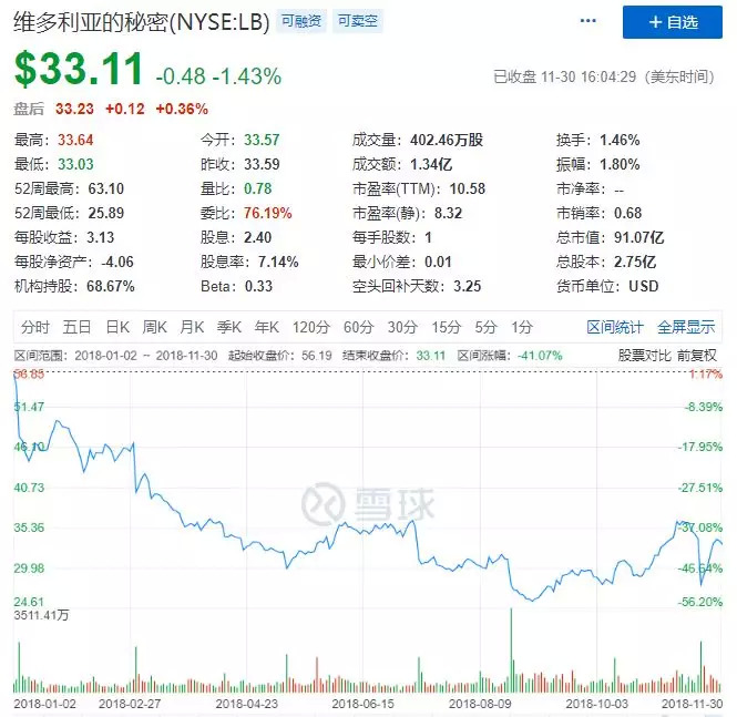 在截止于11月3日的一个季度里,维密母公司L Brands净亏损4280万美元,约合人民币3亿元。今年以来,其股价一路下跌,暴跌4成左右,市值蒸发过半,仅余91亿美元。