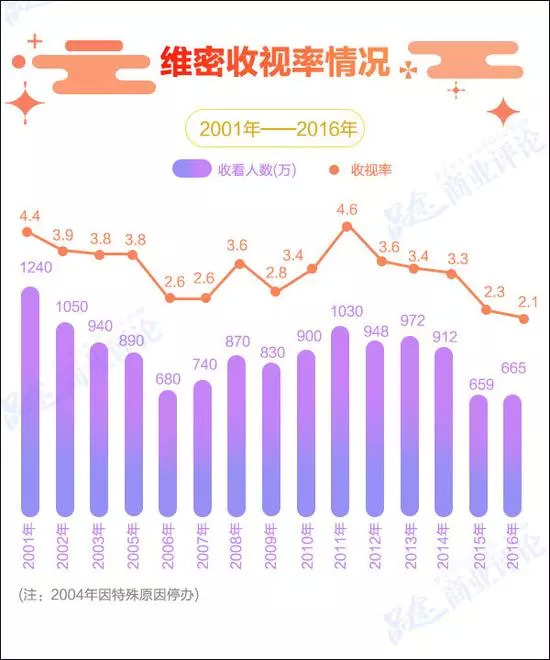 到2017年,其收视率创下维密秀史上最新低,只有1.5,收看人数比2016年下跌了将近30%,观众总数还不到500万,与去年同期相比下降了32%。